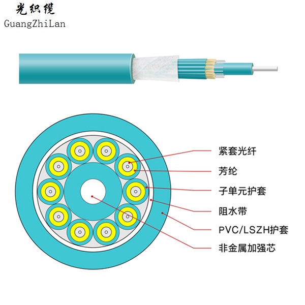 光織纜品牌的綜合布線系統中的GJFJHV光纜結構是將緊套光纖表面放置芳綸加強元件然后再擠層護套制成子單元,子單元與非金屬加強件FRP(和可能有的墊層)絞合成圓形,在纜芯和護大之間繞包一層干式阻水帶,最后擠制PVC(或LSZH)護套成纜。