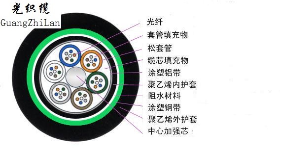 光纜的結(jié)構(gòu)是將 250μm 光纖套入高模量材制成的松套管中,松套管內(nèi)填充防水化合物。纜芯的中心是一根金屬加強(qiáng)芯,對(duì)于某些芯數(shù)的光纜來(lái)說(shuō),金屬加強(qiáng)芯外還需擠上一層聚乙烯 (PE)。松套管(和填充繩)圍繞中心加強(qiáng)芯絞合成緊湊和圓形的纜芯,纜芯內(nèi)的縫隙充以阻水填充物。涂塑鋁帶(PL)縱包后擠制聚乙烯護(hù)套成纜。